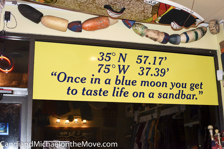 Insider tip: Eat at the Blue Moon Beach Grill in Nags Head. A couple of locals told us we had to eat at the Blue Moon Beach Grill so one Friday night we headed south for dinner. Like so many places here, they don’t take reservations but we thought we wouldn’t have too long a wait since it was off-season. We arrived around 7:30 and all the tables were filled but the hostess thought it would only be about a 15 minute wait. There was room at the bar so we ordered some wine and started taking in the sights.