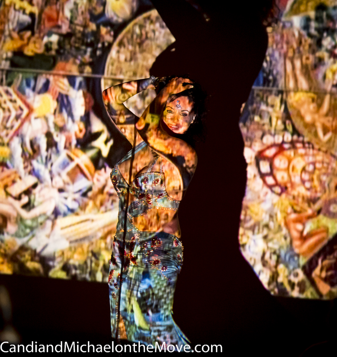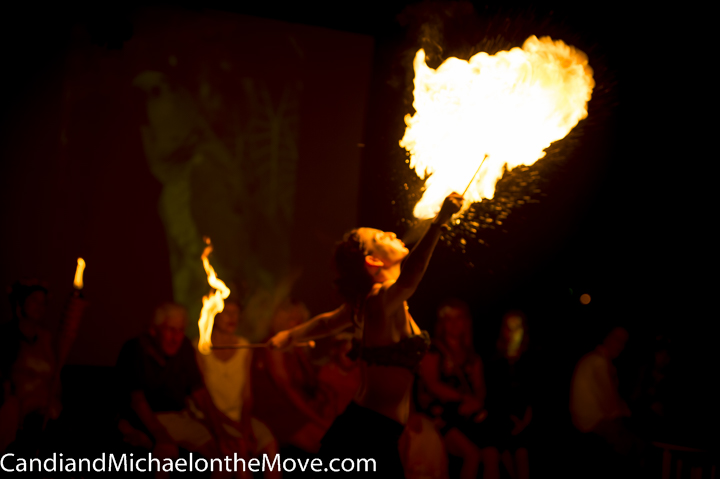 The second venue was an outdoor stage area where there were hula hoop demonstrations, belly dancing (both a performance and participatory dancing), Salsa dancing, poetry reading, sword dancing and an amazing fire eating demonstration. All this was backed by a fantastic video show once it was dark which added to the fun and mystery of the dancers as the colors flowed across their bodies and their shadows danced behind them.