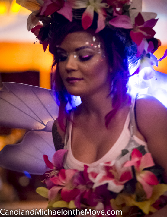 This is the 8th year this event has been held and people knew there was a contest for “best dressed” and really got into the spirit of the night. There was a face painting and headdress booth right inside the door so I got my face painted and a flower headdress with beautiful ribbons hanging down so I’d fit in with the scene. As always in Key West, dogs were welcomed and some also came in costume. One thing I thought was particularly cool was there were a number of dogs available for adoption that were being walked through the event with coats saying adopt me. I thought this was a great way for people to see animals who needed a home and hopefully a few went home with new families to love them.