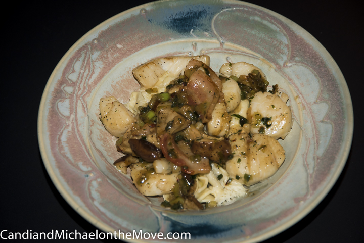 Scallops with a garlic, Skitake mushroom sauce, served over tortellinis