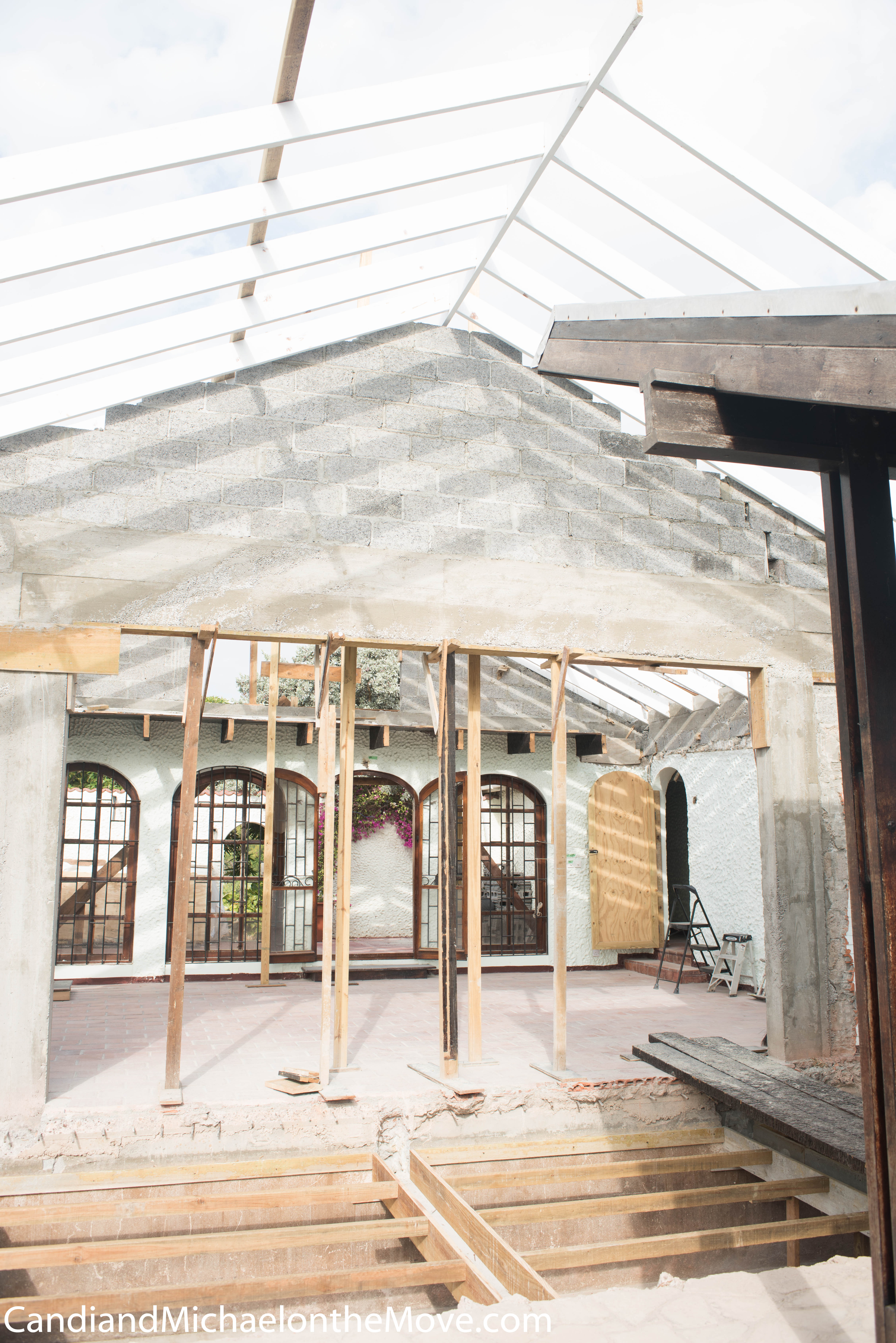 The back wall of the house has been blocked up – not too big a job since we still have a 16 by 10 foot opening that will end up having an iron grate.  By completing that step, they are getting ready to put on the wooden ceiling layer of the roof.  (We’re still waiting for the aluminum roof covering to arrive and get processed through customs.)
