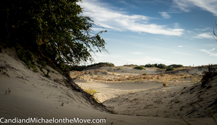 We still had some lovely afternoon sun so we stopped by Jockey’s Ridge State Park on the way home. Jockey’s Ridge has the highest sand dunes on the east coast, some towering 120 feet high. This is a large park that looks like a small desert in places and also has lovely wooded trails that lead to the Currituck Sound. This is also a very popular area for people to hang glide, catching the prevailing winds that rush over the dunes. We took Anne to the sound beach which, like so many places here, is incredibly beautiful. It has a submerged sandbar peninsula that juts out into the sound. At low tide, you can walk way out into the sound and be surrounded by water which is really cool.