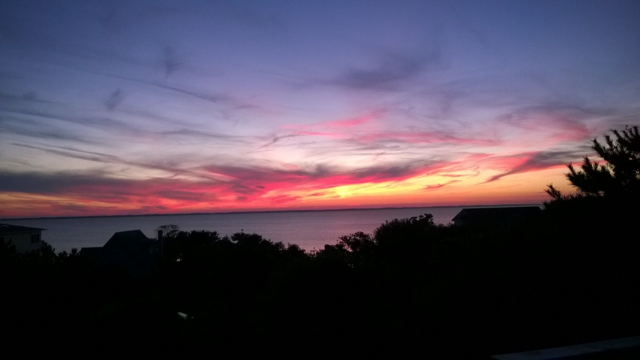 We continued on and I showed Anne that Duck had constructed a boardwalk that extends the length of the downtown area along the Sound which gets people off the road and into nature between clusters of shops. The boardwalk views are breathtaking. We strolled along, popping into a few more shops and then came to the end just before sunset. I called Michael and invited him for a drink on the deck of the Blue Point Bar and Grill. Anne and I grabbed a waterside table, we ordered drinks and the toasted a great day and a beautiful sunset with Michael. The sky was crystal clear, the setting sun was golden and then the sky turned from purple to deep red with a sliver moon above. It was so lovely. We headed home and Michael made a delicious dinner of steak, rice and veggies. It was a great meal with lots of great conversation.